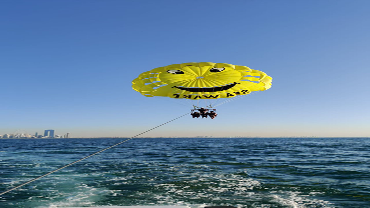 • This parasailing experience begins with a 20-minute boat ride into the water. Enjoy the coastline sights and get a unique perspective on JBR hotels, Palm Jumeirah, the Marina, and Dubai eye. The parachute and the boat's speed will place you 200 meters above the water.