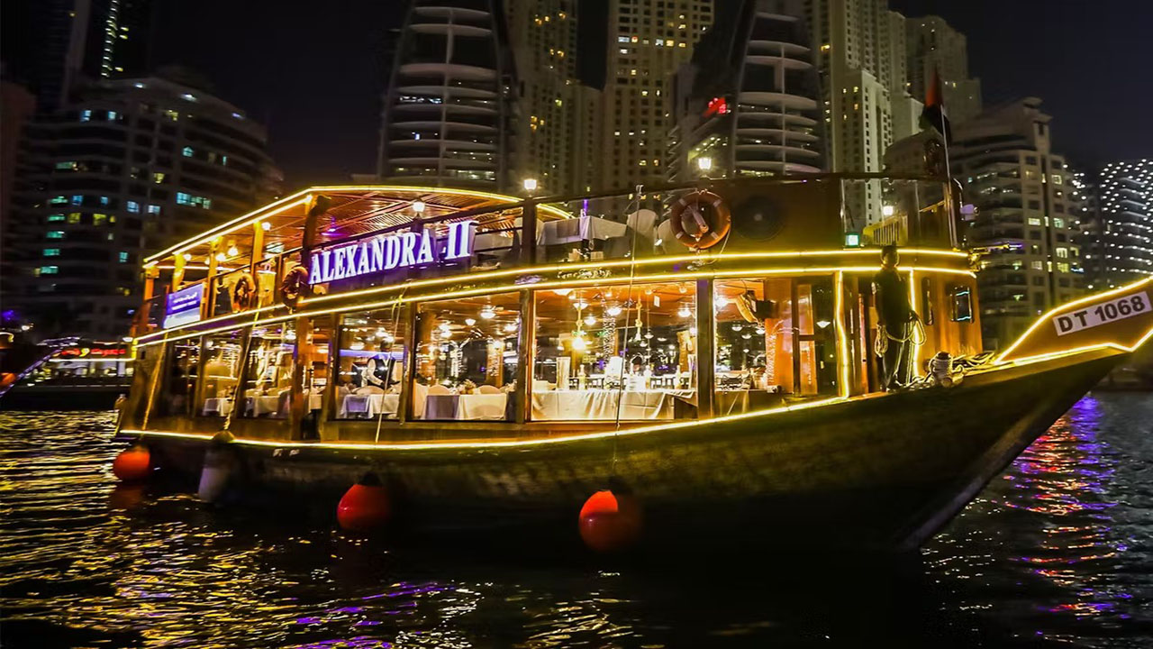 • Dubai Marina is lined with some of Dubai’s most futuristic buildings, but seeing them by day can mean walking in often searing heat. Make your sightseeing easier—and view the landmarks at their illuminated best—on this luxe dinner cruise. Sail the marina aboard a gleaming catamaran, admire icons like the Cayan Tower and Ain Wheel; and along the way, savor an international buffet and sparkling “tanoura” whirling dervish dance show.